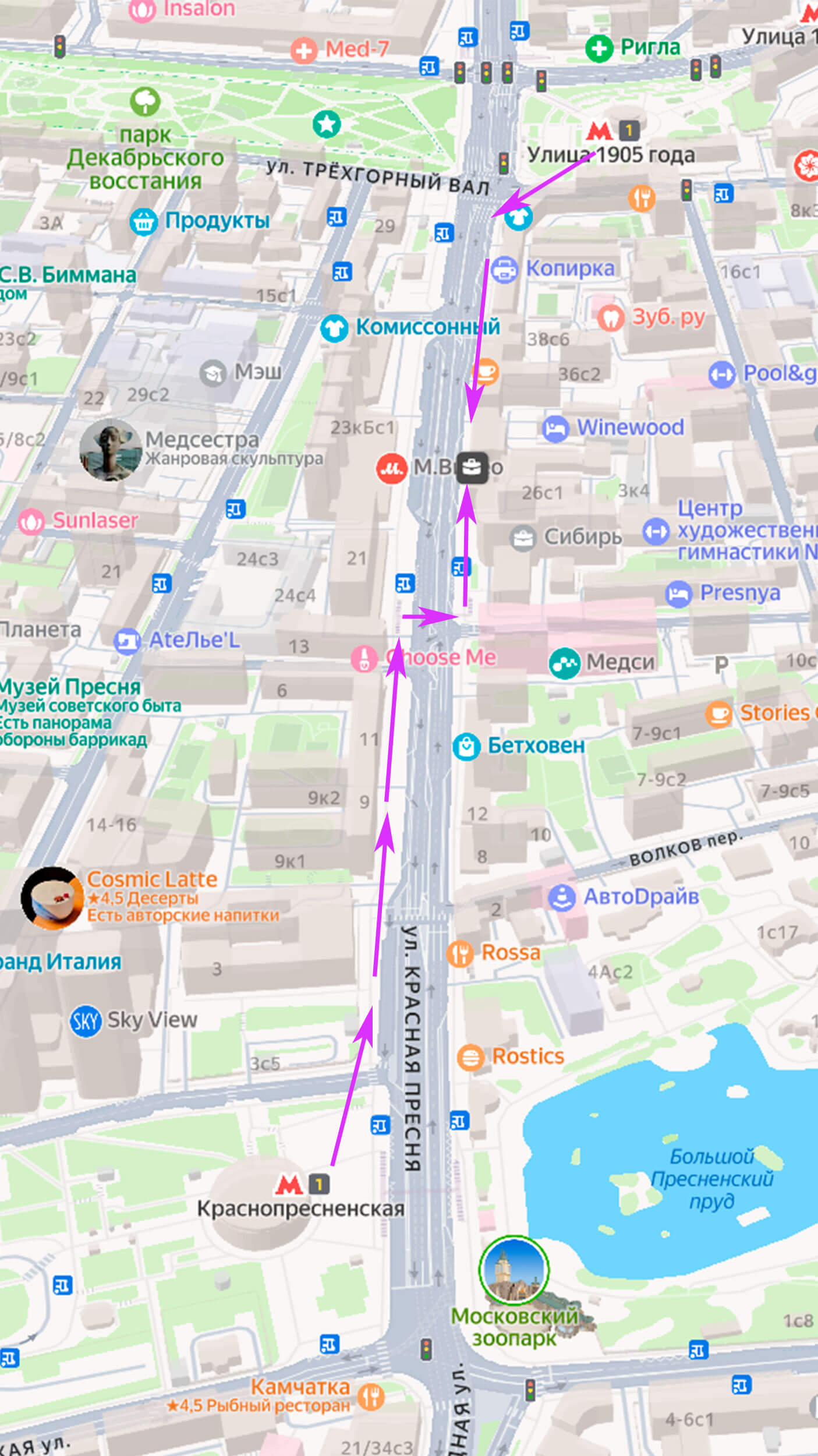 Метро Краснопресненская. Выход 1. При выходе в город налево. Прямо 400 м до подземного перехода. Переходите на другую сторону. Прямо 100 м.